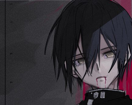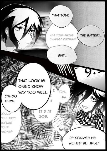 Ouma confronts Saihara about his developing sickness. Saihara looks away and clenches blood splattered sleeves; blood that is disguised by dark fabrics.Just like always, Ouma sees right through him.